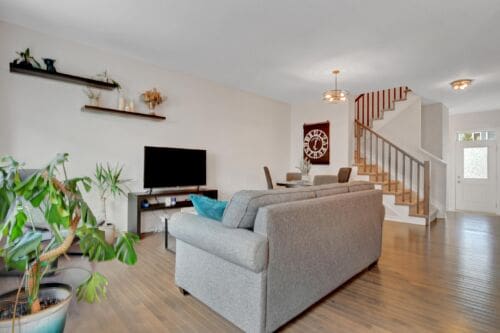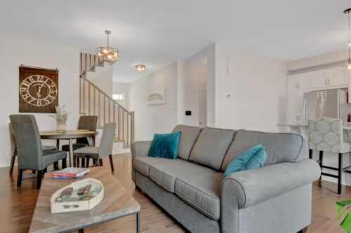 Welcome to this beautifully maintained 2019-built Caivan townhome in the sought-after community of Chapel Hill South, offering a truly turnkey opportunity with numerous builder upgrades throughout. Lightly lived in and exceptionally well cared for, the home is filled with natural light thanks to large windows and features a fresh, modern feel with recent paint and new light fixtures installed throughout in 2025. Located in a quieter, less busy pocket of the neighbourhood, it offers a peaceful setting while remaining close to many of Orléans’ everyday amenities, including shopping, recreation facilities, restaurants, and schools. The main level features a functional layout with a bright kitchen showcasing white cabinetry, stainless steel appliances, and a new ceramic backsplash completed in 2025, along with custom-fitted window coverings and a convenient mudroom with direct access to the attached single-car garage, which also includes additional storage space. Upstairs, all three bedrooms include walk-in closets, with the spacious primary bedroom located at the rear of the home and featuring large windows and a private three-piece ensuite with a stand-up shower. The second level is thoughtfully designed with generous hallway space between bedrooms and a notably large four-piece main bathroom. The finished basement provides valuable additional living space and ample storage, while the mechanical room is equipped with an HRV, a built-in furnace humidifier, and a tankless hot water system. Outside, enjoy a fully fenced backyard featuring a composite deck built in 2023, ideal for relaxing or entertaining.